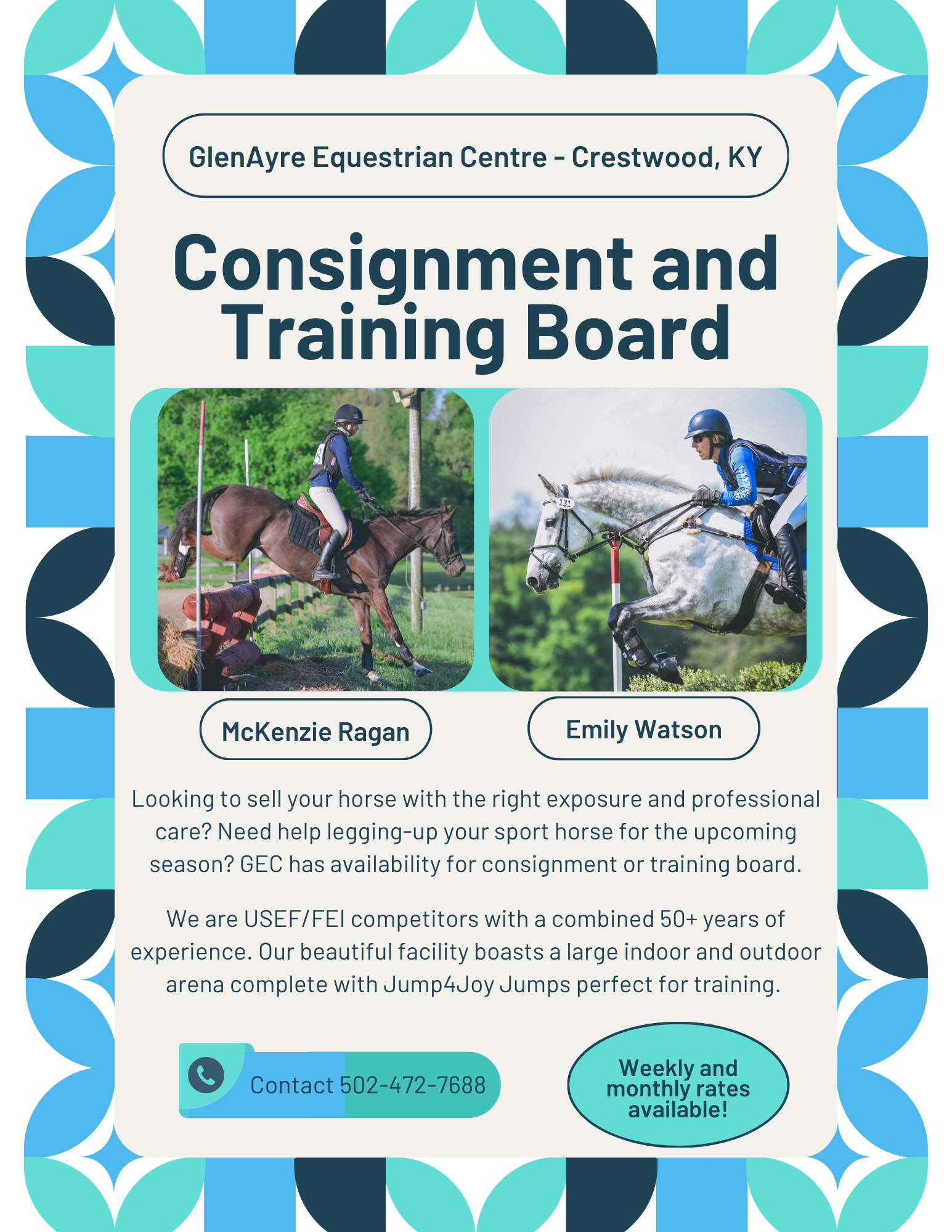 We use USEF/FEI competitors with combined 50+ years of experience. Our beautiful facility boasts a large indoor and outdoor arena complete with Jump4Joy Jumps, perfect for training.